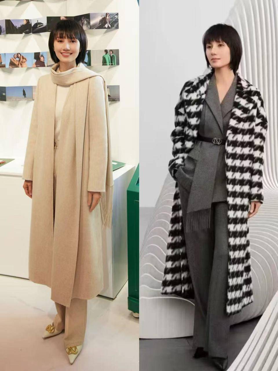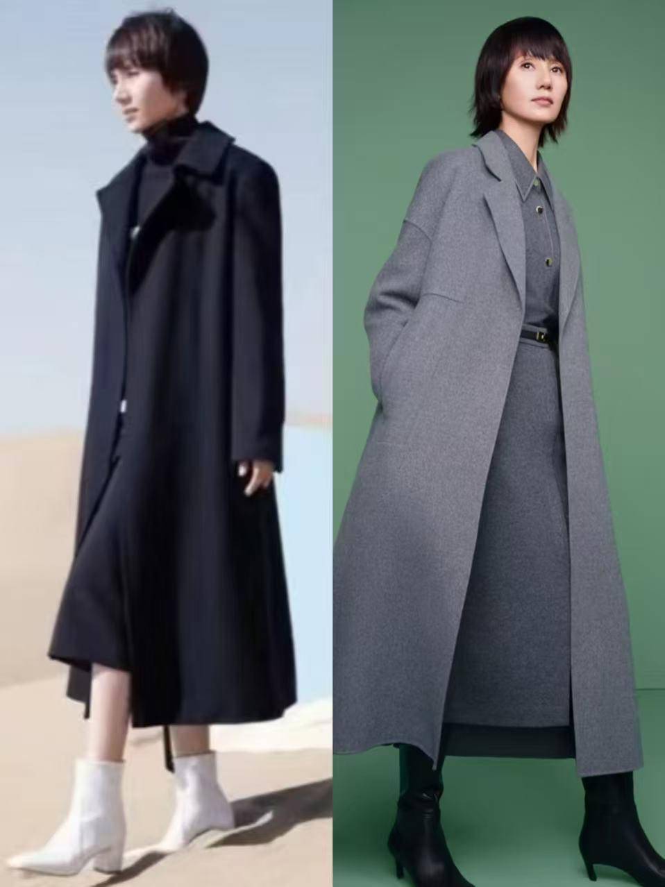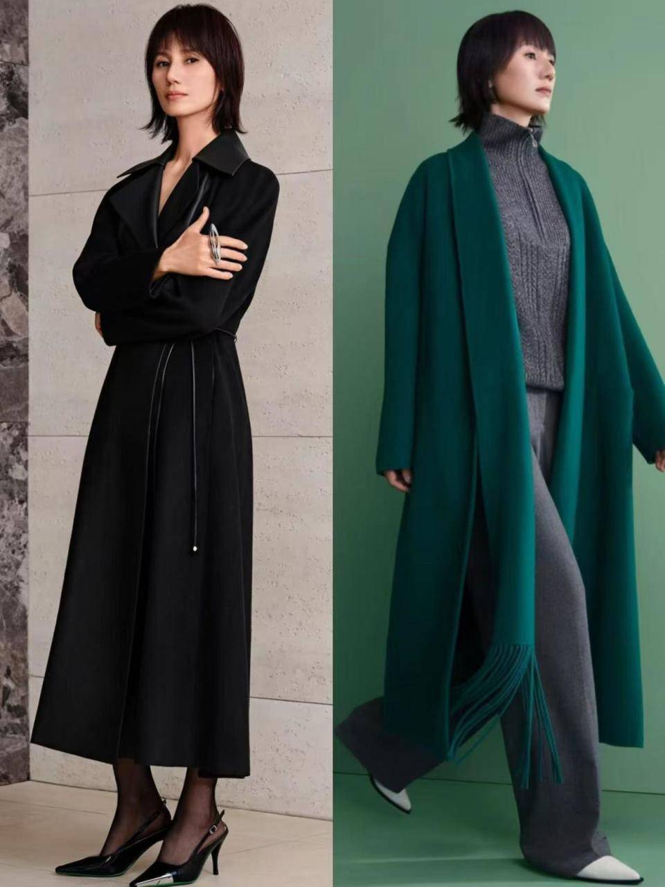 如果想要更好的呈现自己的身材比例,这时候还可以选择x型的大衣外套,例如,女明星袁泉上面这一件黑色大衣外套,就做了一个高腰收腰的设计,穿在身上,再系上腰带,帮助我们轻松打造“高腰线”,显高显瘦显利索,还显得优雅得体。