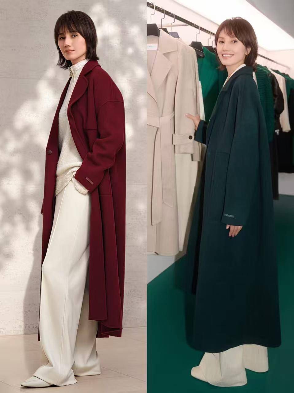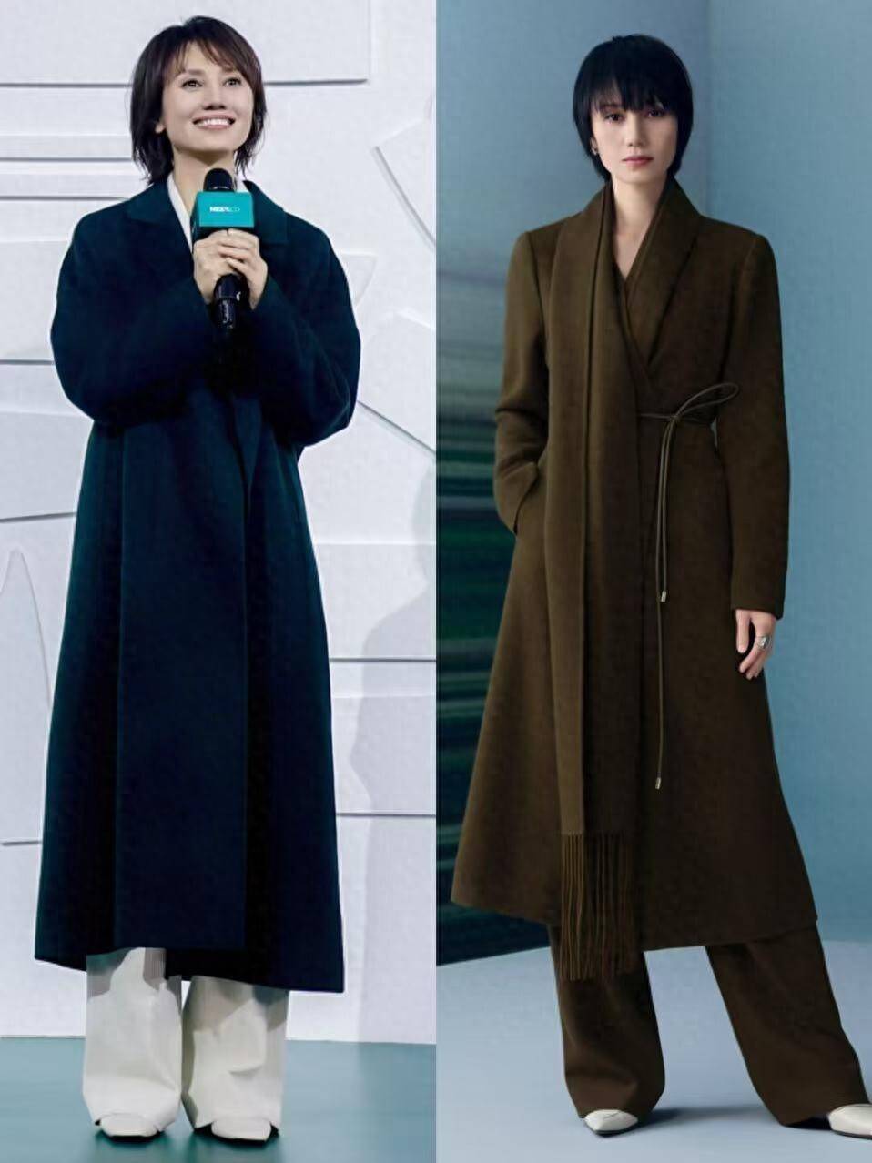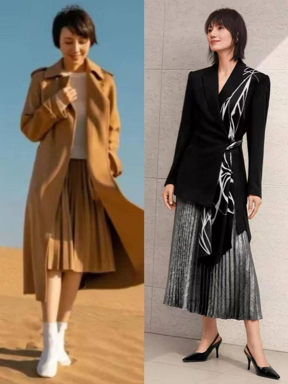 如果想要更好的呈现自己的身材比例,这时候还可以选择x型的大衣外套,例如,女明星袁泉上面这一件黑色大衣外套,就做了一个高腰收腰的设计,穿在身上,再系上腰带,帮助我们轻松打造“高腰线”,显高显瘦显利索,还显得优雅得体。