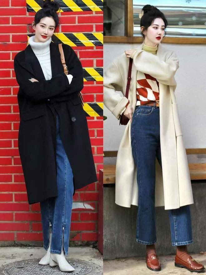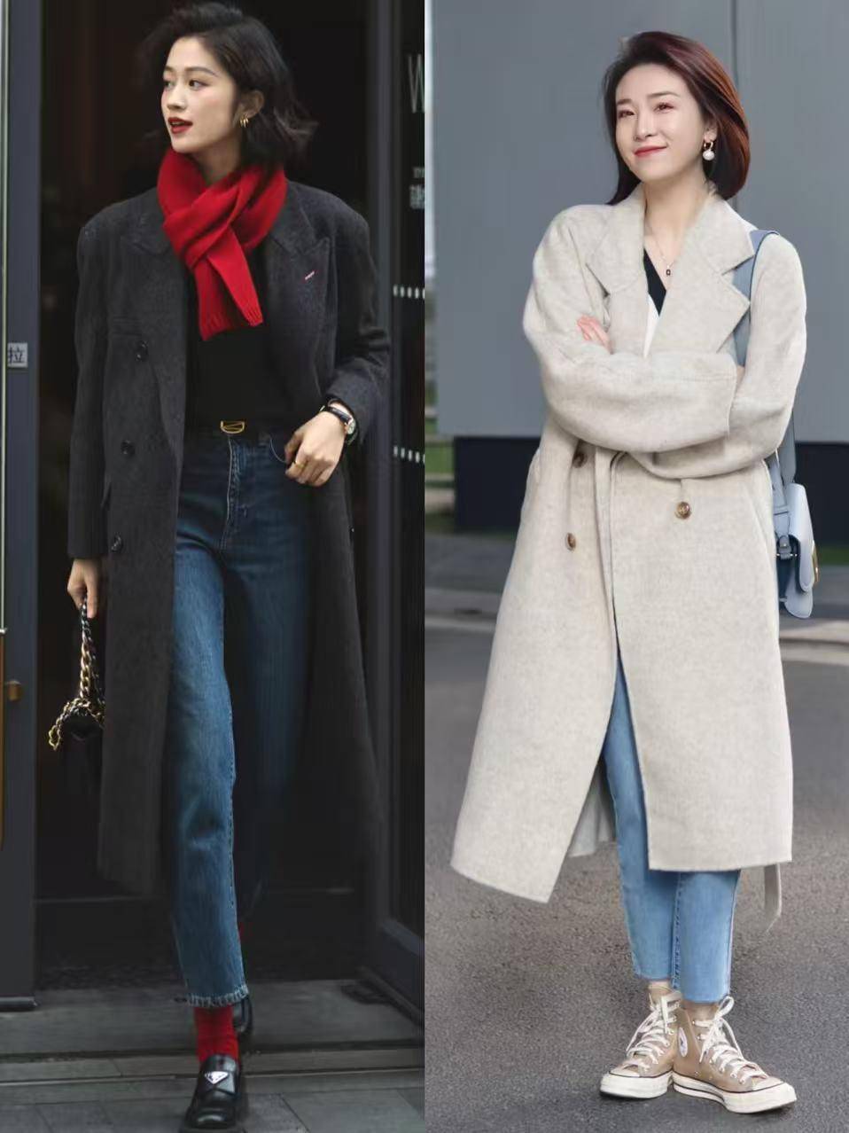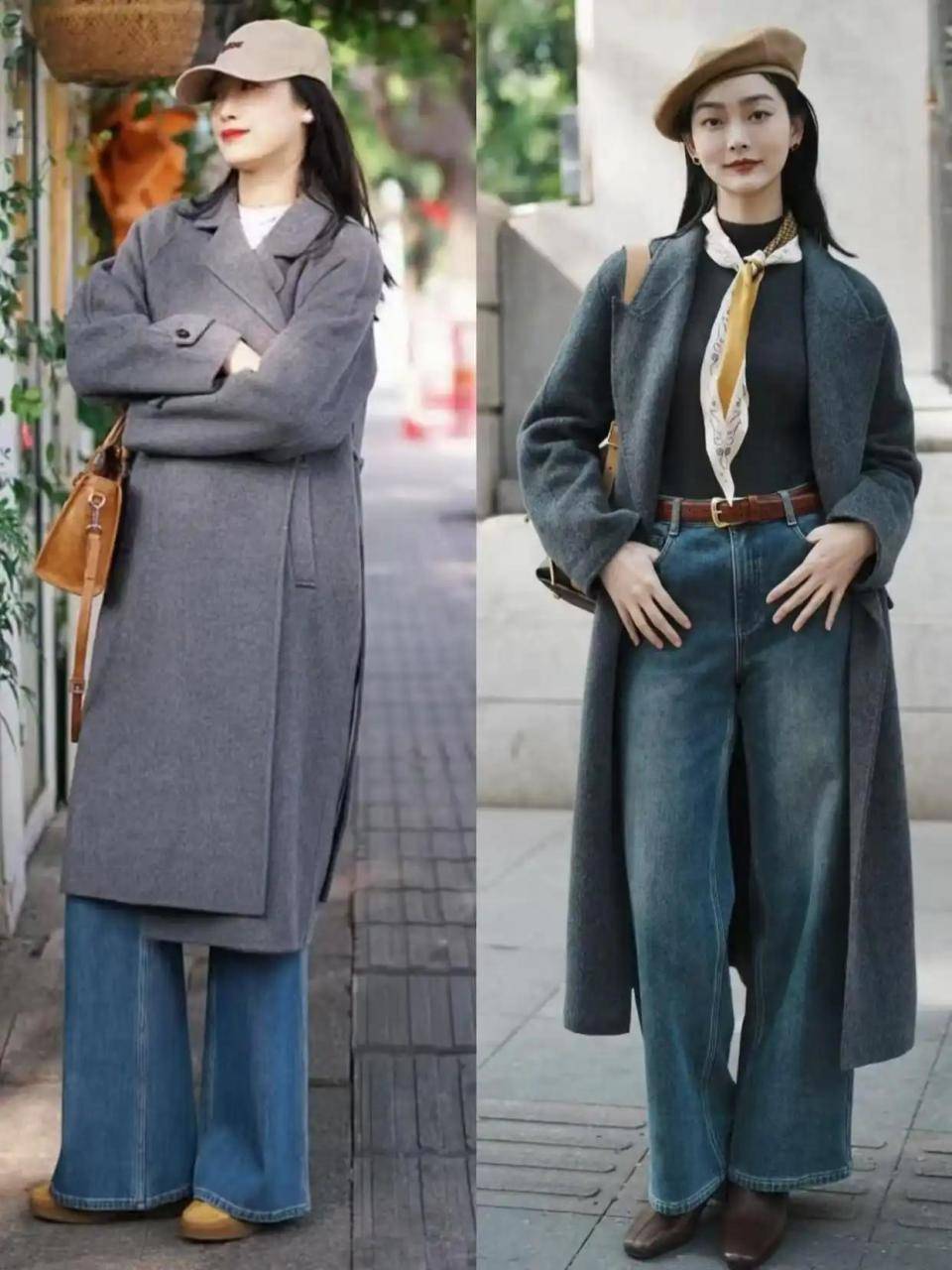 下面这2套穿搭就很不错,用浅灰色和深灰色的大衣外套搭配上牛仔直筒长裤脚,穿一双粗跟单鞋或者是厚底单鞋,轻松穿出通勤风。