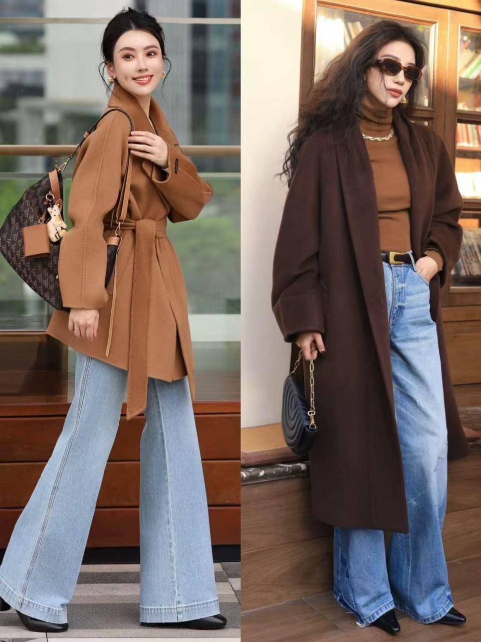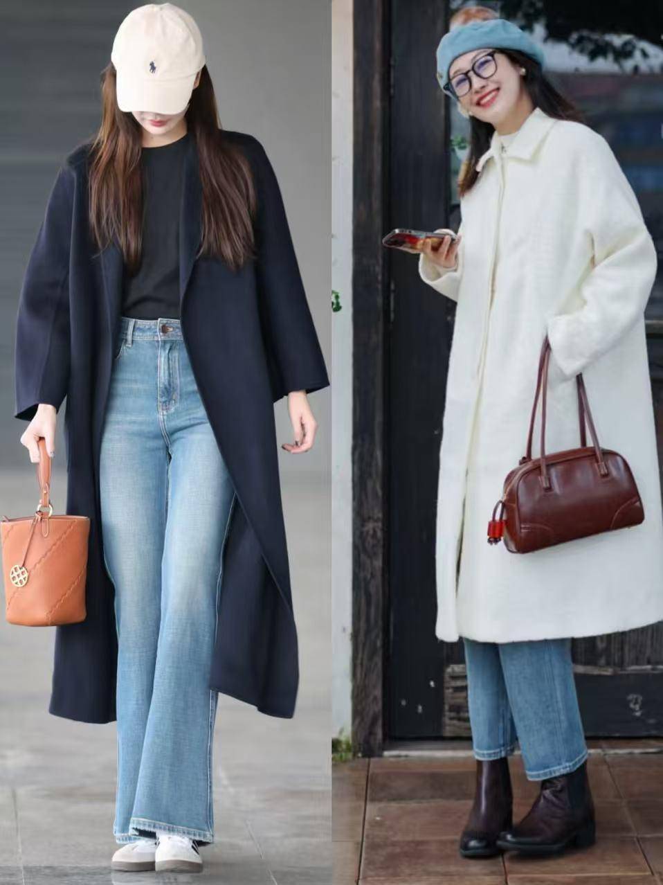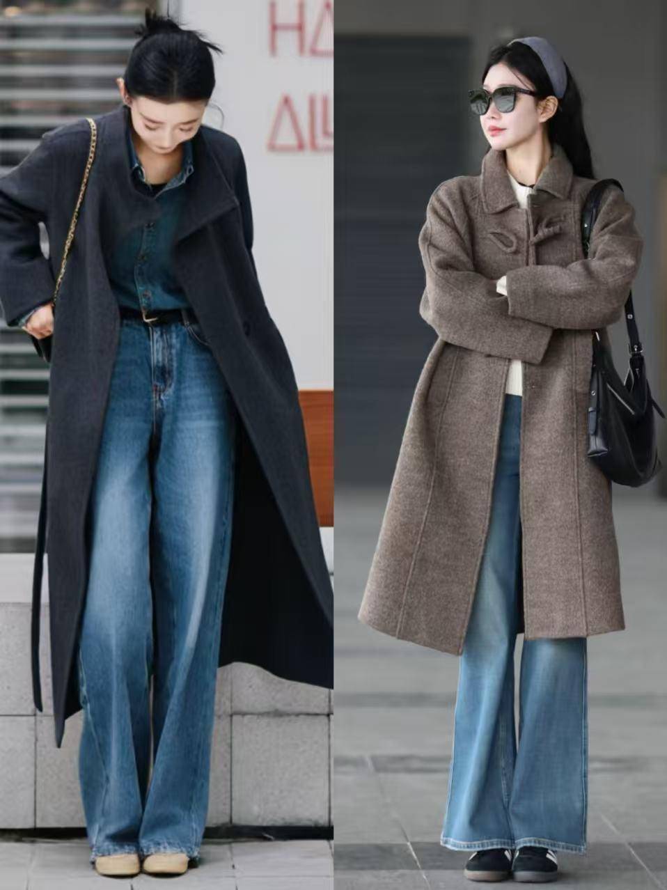 下面这2套穿搭就很不错,用浅灰色和深灰色的大衣外套搭配上牛仔直筒长裤脚,穿一双粗跟单鞋或者是厚底单鞋,轻松穿出通勤风。