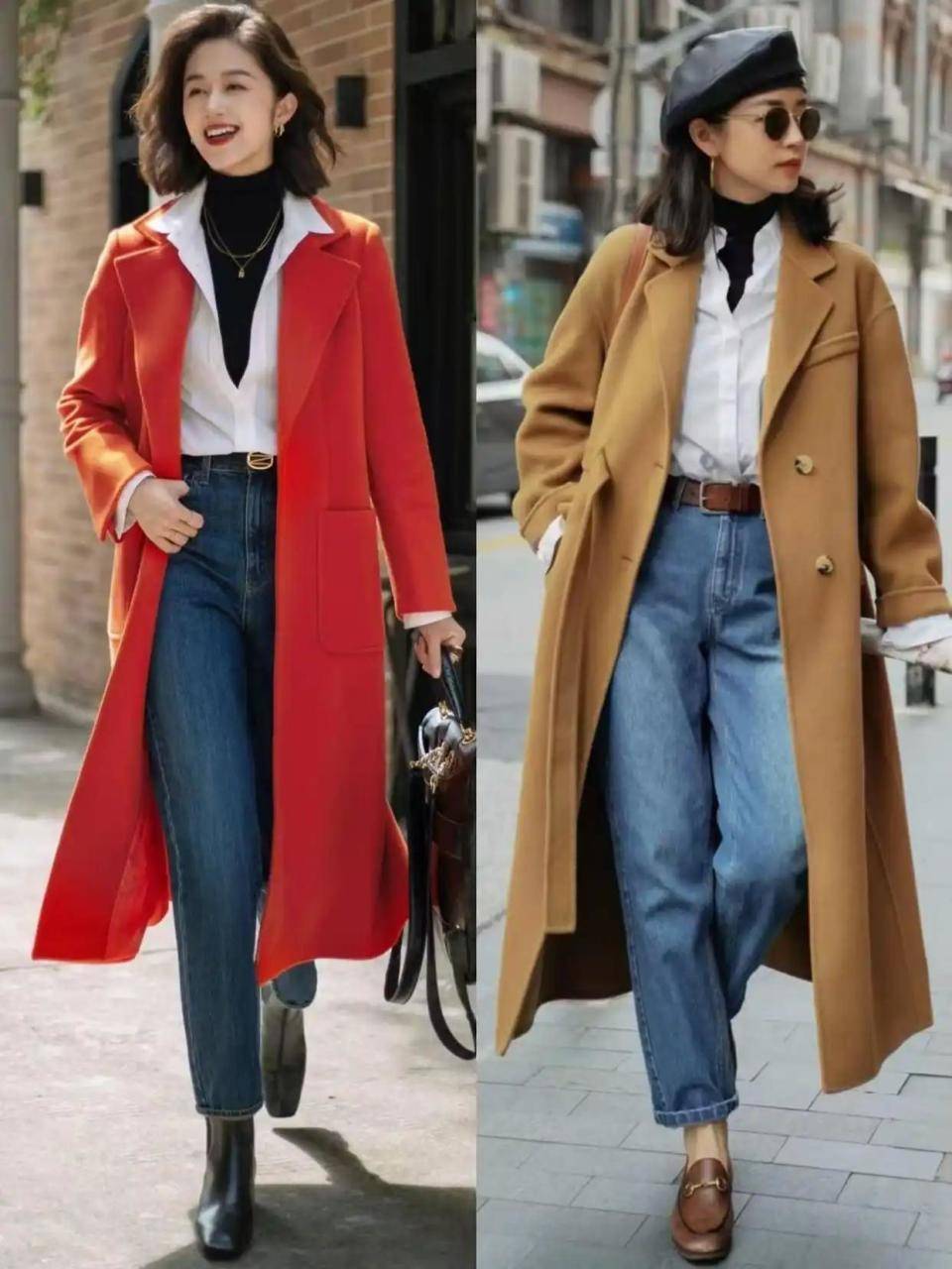 在放弃打底裤和紧身裤的穿法,建议大家可以选择天生,就拥有时尚元素的牛仔烟管裤,比如上面用红色大衣和驼色大衣来搭配上蓝色牛仔裤,内搭白色衬衫叠穿黑色针织衫,脚上穿的鞋子分别是皮质的短靴和驼色乐福鞋,这样的造型女神范十足,气场全开。