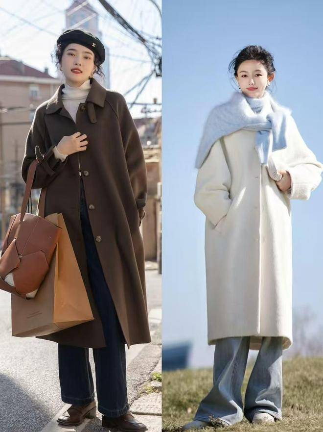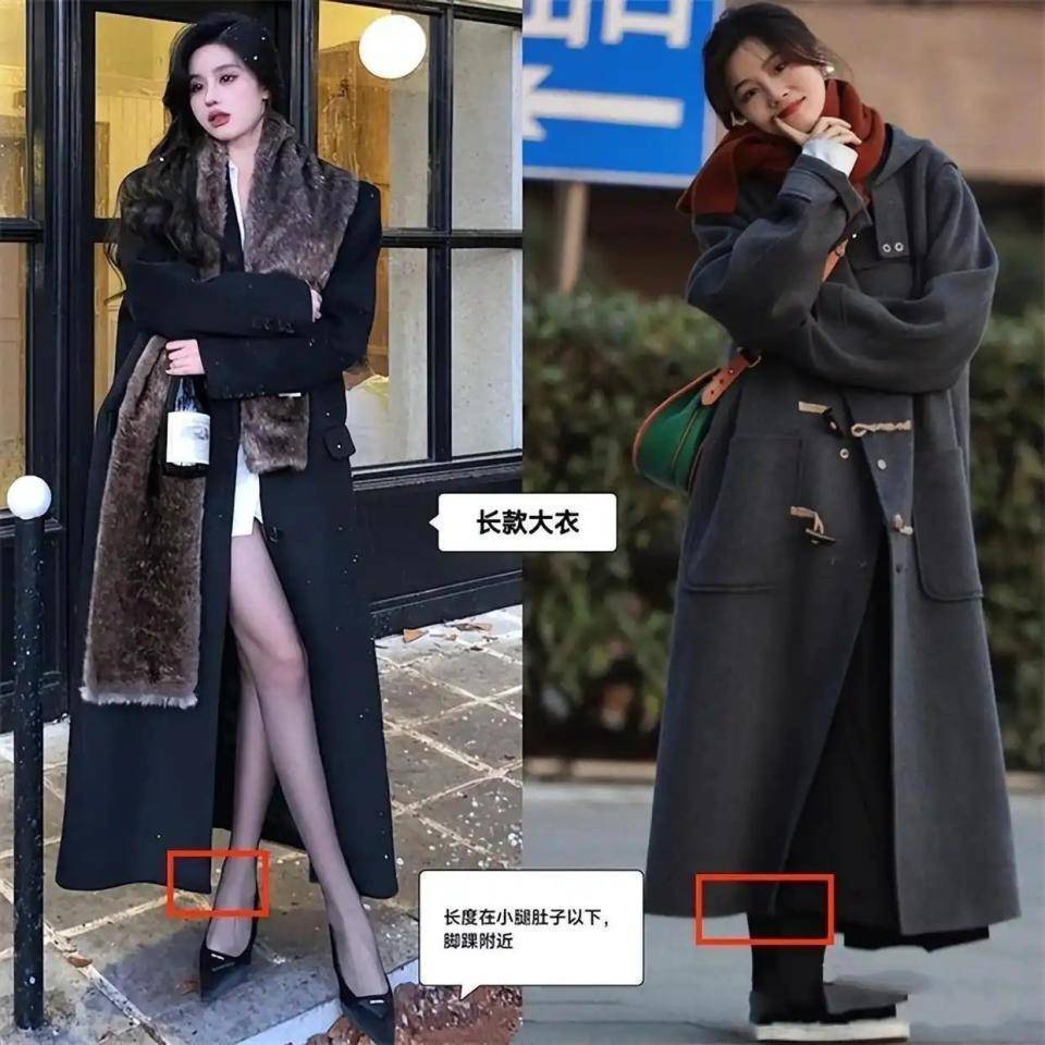 如果咱们是小个子女性,想要身材线条比较流畅,让自己显高显瘦,推荐选择上面这种h型的大衣外套版型,衣服的长度盖过膝盖超过三至五厘米就行,下半身直接选择直筒牛仔裤来搭配就够,就能让你变得高挑纤瘦,精致洋气。
