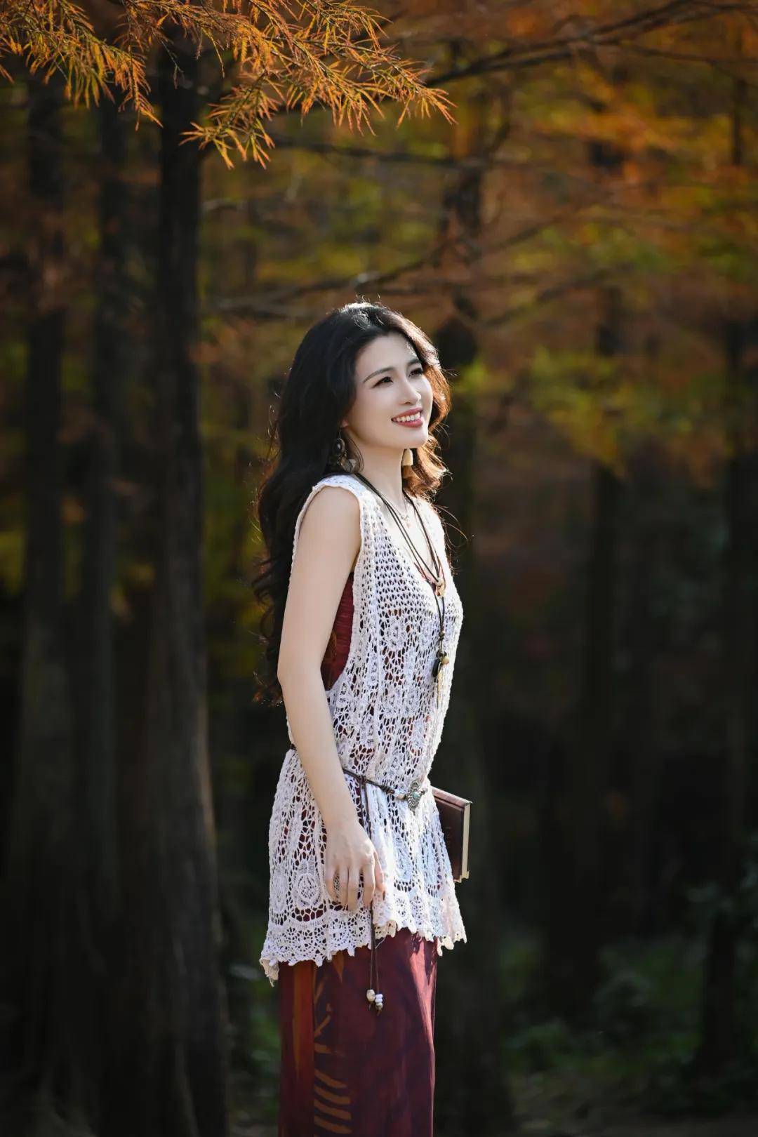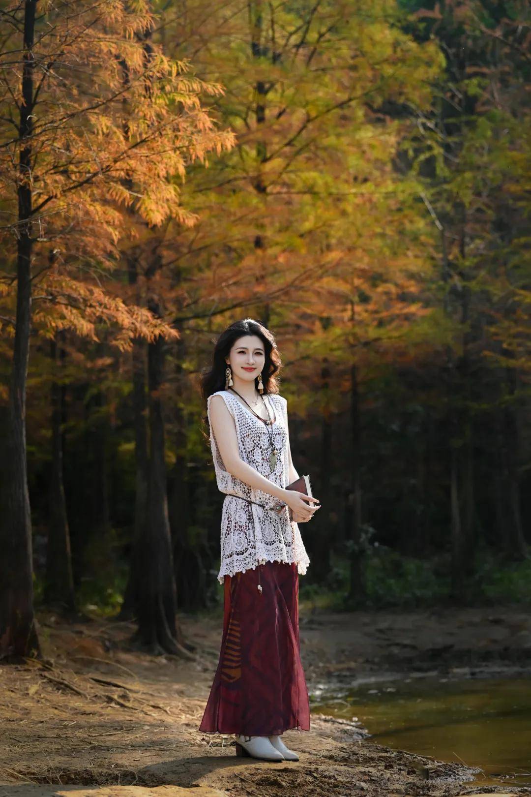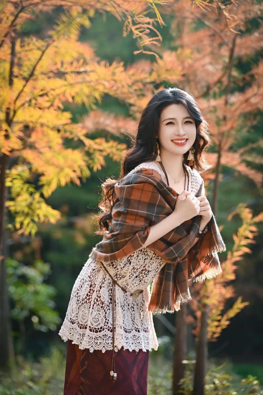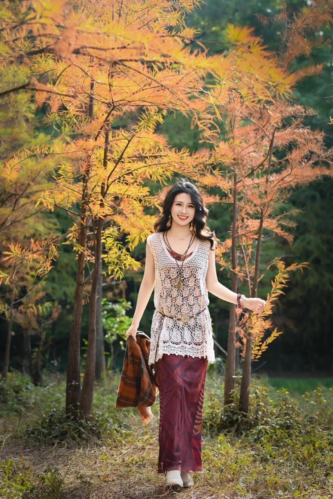 树林拍照中如果穿的是裙子,可以侧着身体站,一只手轻轻提一下裙摆,身体微微往前俯一点,头低下来笑,这个动作会让整个人显得很柔和,也能让画面多一点细节,看起来更精致。
