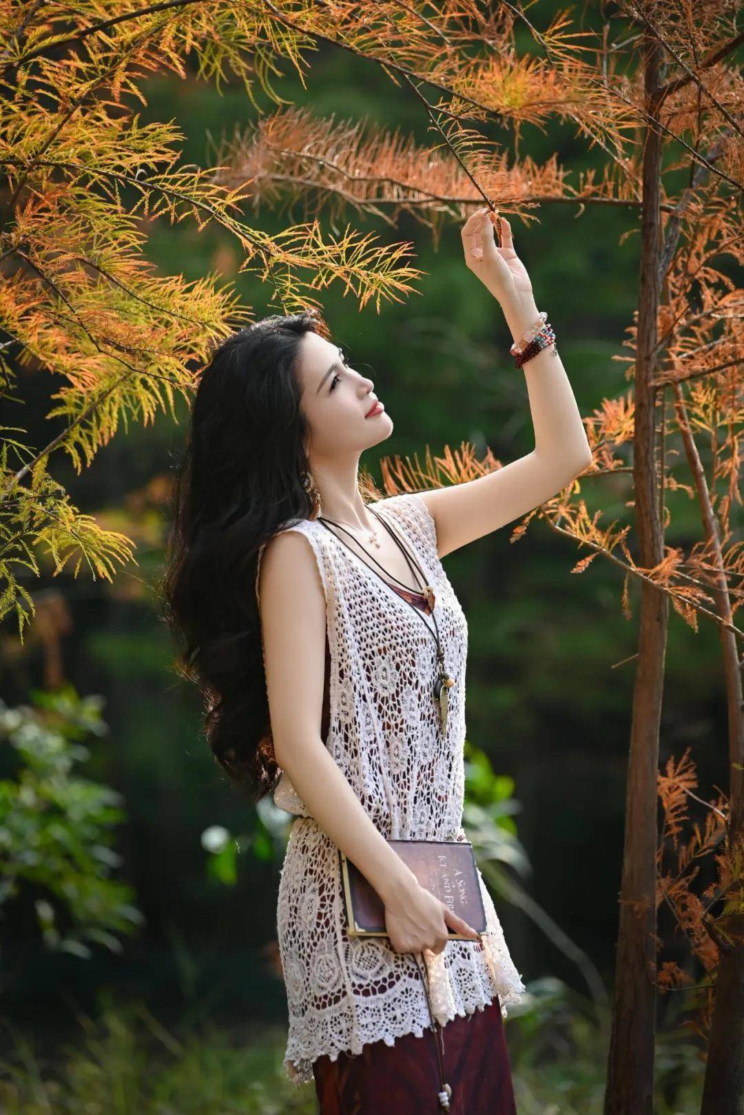 树林拍照很适合和环境有一点互动,侧身站在树旁,手自然抬起来摸一摸树叶,视线可以跟着手走,这样拍出来的照片会显得很自然,人和树林之间会有联系,画面也更有氛围感。