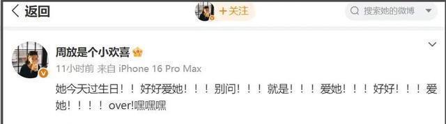 02 赵丽颖38岁生日当天,周放凌晨准时发文,但这次内容却是“她今天过生日!!好好爱她!!!别问!!!就是!!!爱她!!!好好!!!爱她!!!!over!嘿嘿嘿”。 这一连串的感叹以及“爱她”这两个字, 让不少网友好奇,这话....是对自己说的?还是对某人说的?