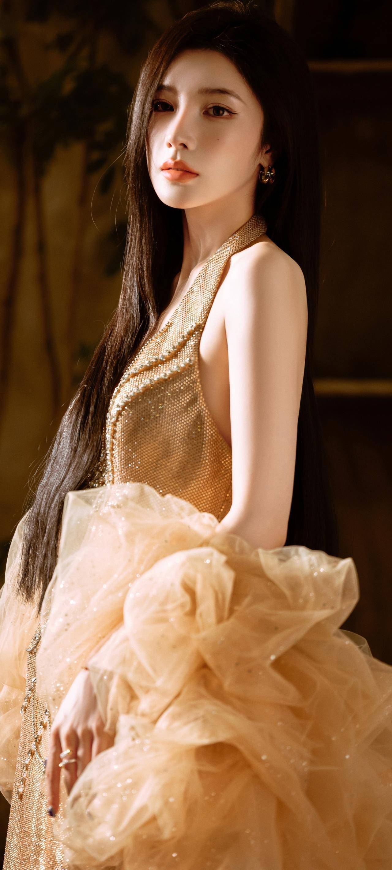 戴燕妮,优雅红唇,金色晚礼服,气质女神!