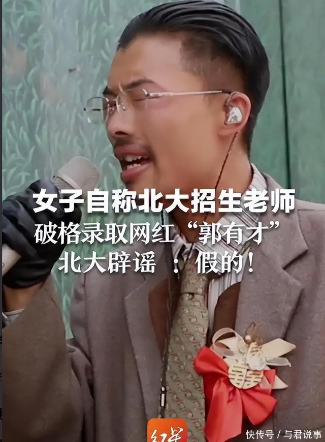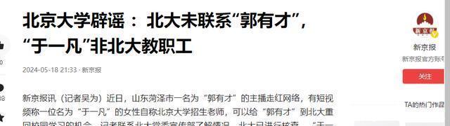 一时之间,他的商业价值大大降低,许多官方平台纷纷抵制,团队为了挽回热度, 他们编了“北大破格录取郭有才”的谣言, 还伪造了个叫“于一凡”的招生老师。 一时间,网络上“北大破格录取网红郭有才”的话题迅速登上热搜。 然而,北大官方的一纸辟谣,让这场闹剧戛然而止。