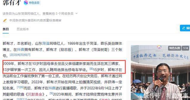 ——【· 一曲《诺言》天下知 ·】—— 其实, 郭有才在爆火之前也是个苦命人! 岁没了妈,亲爹重组家庭后他就跟着三姨过,13岁就开始辍学扛活,修电车、卖鞋子、当前台,只要能赚钱,啥苦活儿都干过。 有了钱后就想闯一闯,于是在家门口开了家小店, 可没想到刚开业就赶上门口就修路,直接把生意堵黄了。