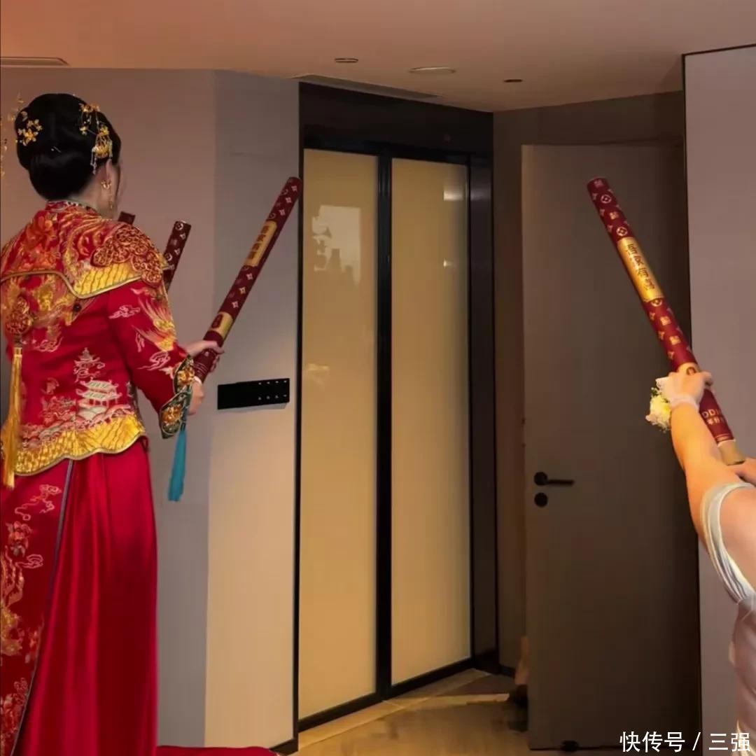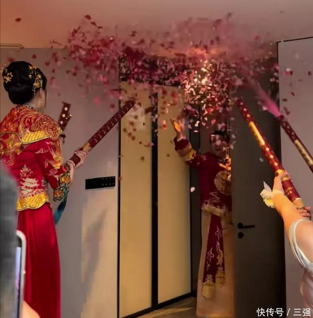 她在门内拉开礼炮筒迎接他,他进门向她撒花娶她回家,氛围感的真实温馨喜庆。