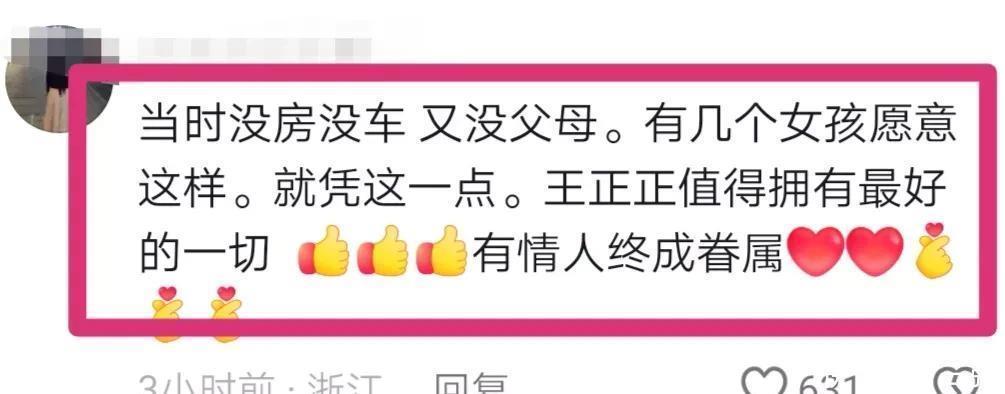 所以很多网友称赞说:在解清帅一无所有,没房没车、无父无母的时候,王正正都没有嫌弃他,就凭这一点,可见解清帅品格很好,而王正正也值得拥有最好的一切。
